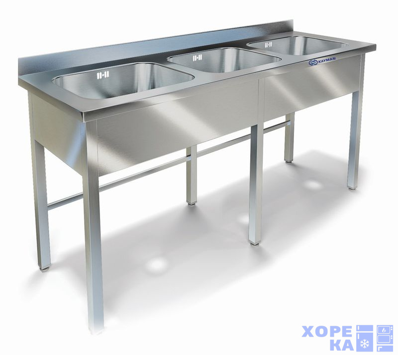 2100х700х850, ванна цельнотянутая из стали AISI 304 (3 емк.)600х500х300, каркас сварной, труба 40х40 из стали AISI 430, толщина 1,2 мм, рабочая поверхность из нержавеющей стали AISI 304, толщиной 1 мм, борт плоский 70 мм