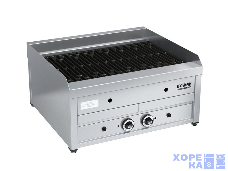 Настольный, 2 горелки, Рабочая зона, мм (Ширина, Глубина)790х475, Защитный борт, мм 50, Газконтроль, запальная горелка, пьезорозжиг, чугунные решетки.